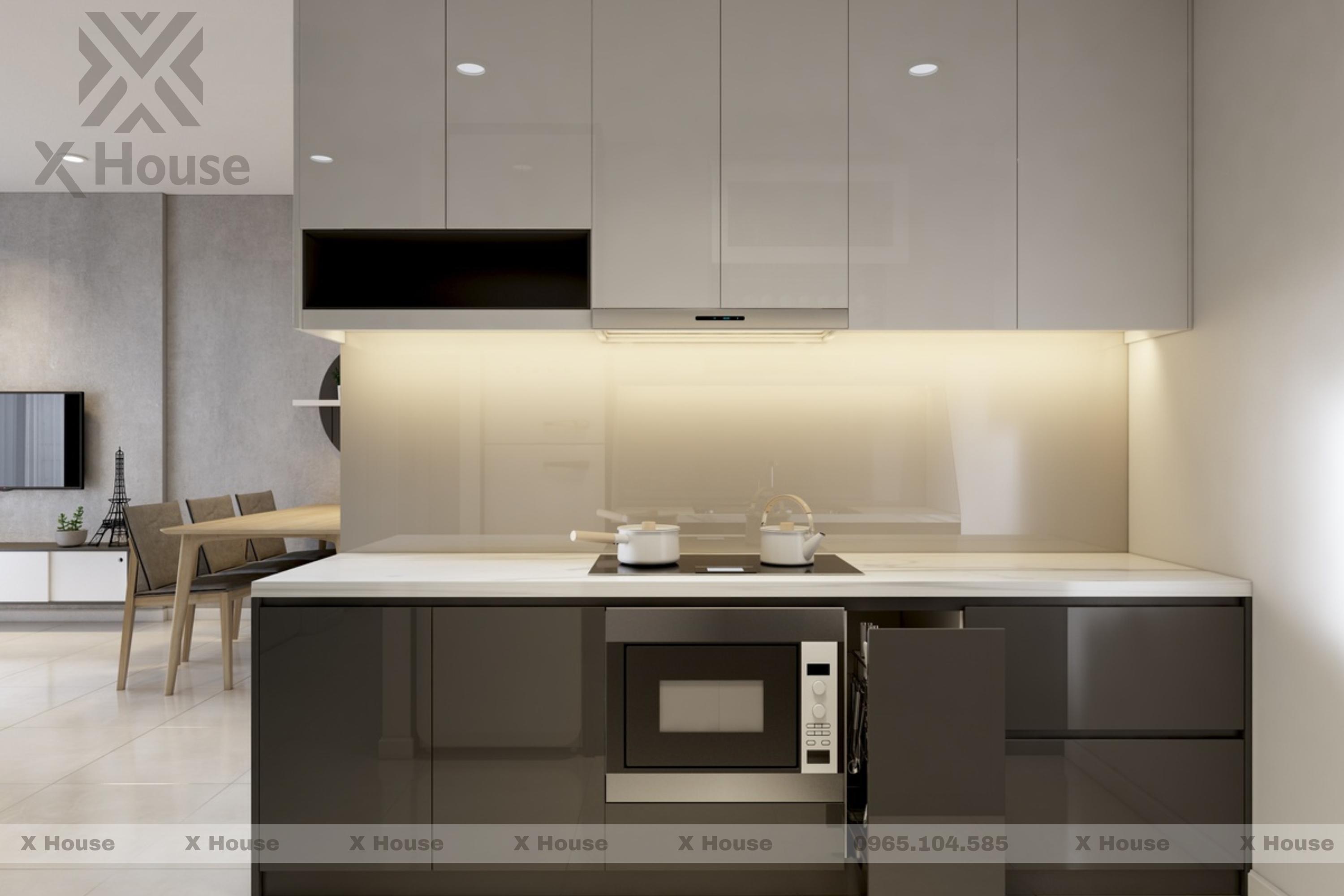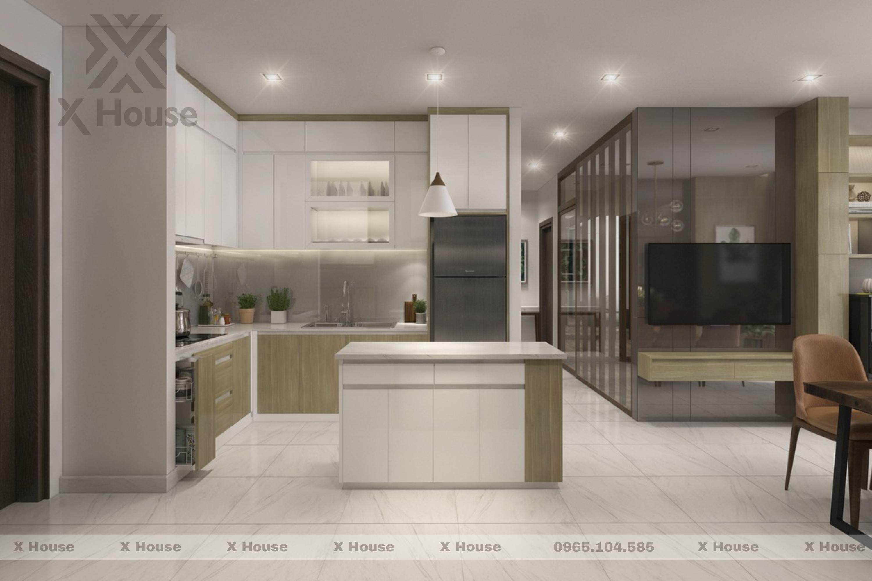 Bố trí bếp hài hòa với tổng thể nội thất căn hộ chung cư.