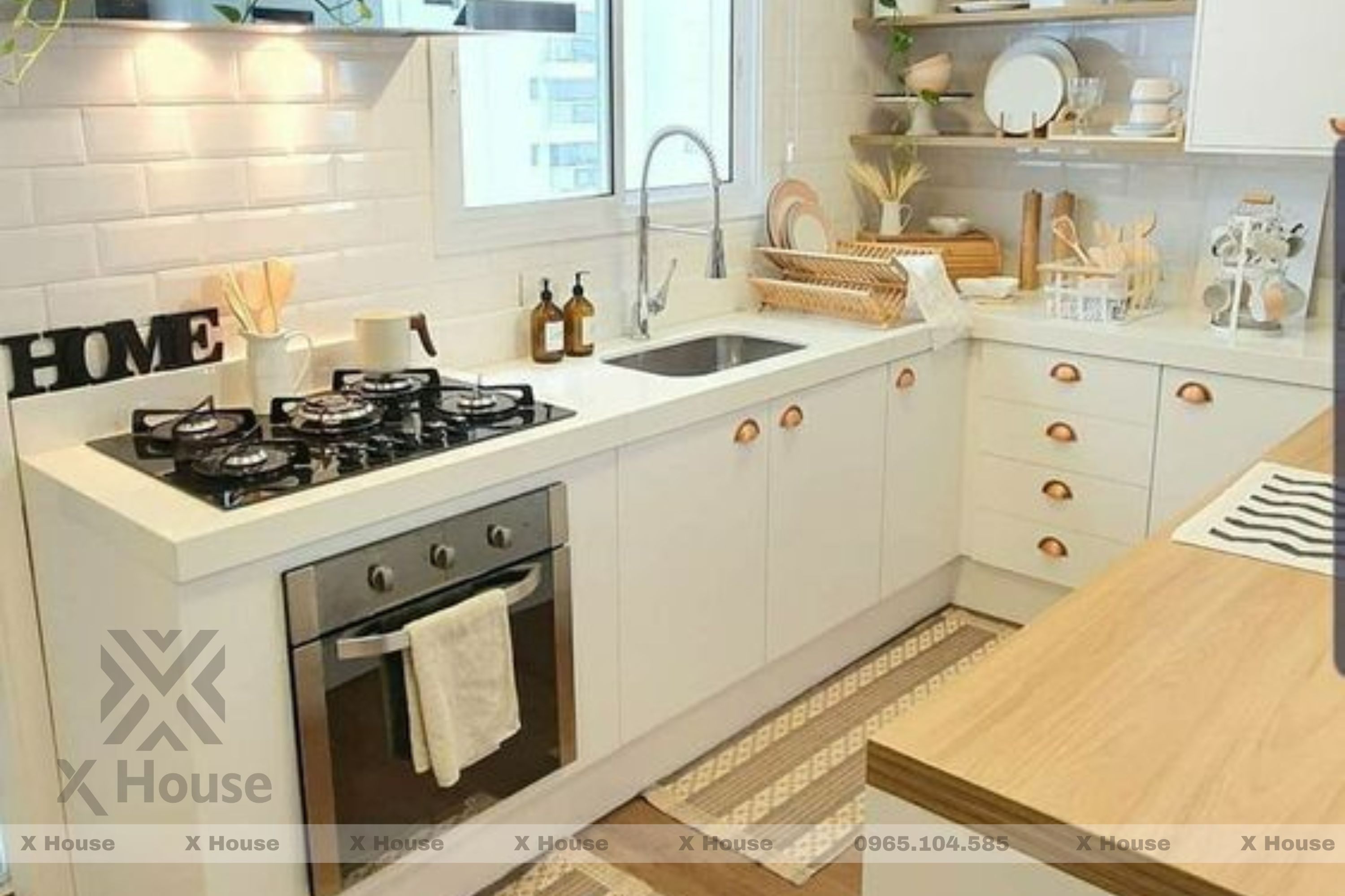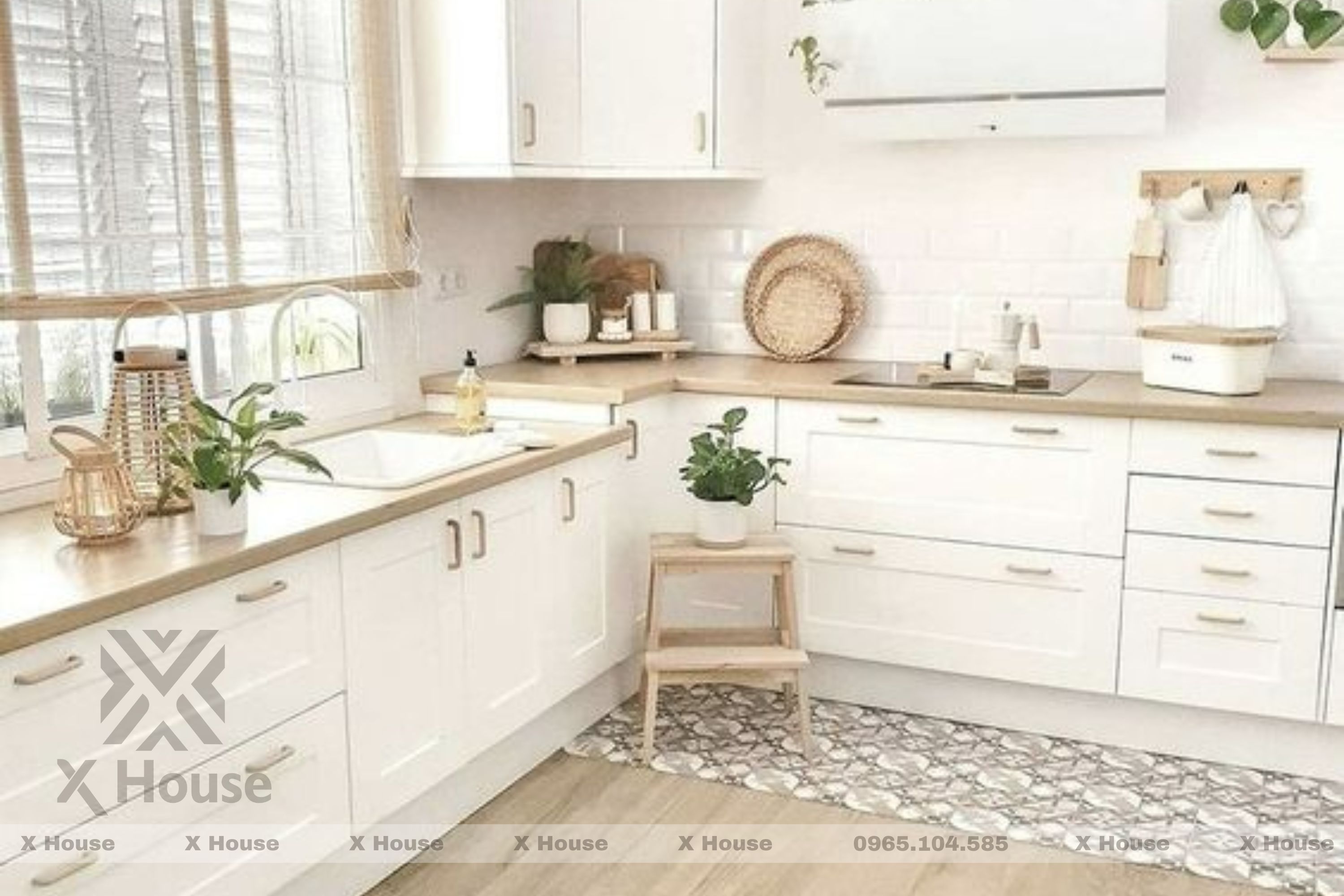 Bếp trắng tinh khôi, kết hợp gỗ sáng, đậm chất vintage nhẹ nhàng.